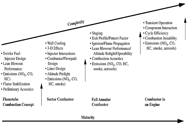 7.5.4.2 Near-Term Technology7.5.4.2.1. General issuesHeightened interest in engine emissions has had a considerable effect on the approach to combustor development over the past 25 years. As with other key fields of gas turbine technology, earlier dependence on semi-empirical and semi-analytical models has been lessened by advances in CFD methods of modeling and analyzing complex flow processes (Mongia, 1994, 1997a). Nevertheless, the complexity of the problems dictates that experimental verification is still required to demonstrate that the combustor meets all emissions, operational performance, and durability requirements. As experience and confidence in these approaches grow, the high costs of combustion system development might be contained-or even reduced slightly. At present, however, modeling is not expected to completely replace experimental testing, especially in the case of more advanced, low-emission concepts for which experience is limited. Thus, the pursuit of advances in combustor technology will remain a major part of the cost of any new engine. A summary of current modeling capabilities, limitations, and potential improvements is given elsewhere (Mongia, 1997a).