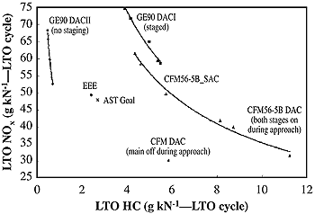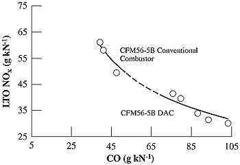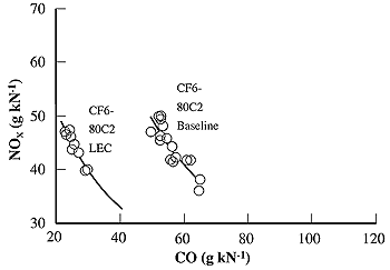 It is important to note that the intrinsic complexity of the combustion process and limitations of current analytical tools lead to considerable uncertainty in prediction of emissions from new combustor designs. Mongia (1997a) estimates that even with analytical models that have been "anchored" to measured data-a process to systematically calibrate a model so that it reproduces measured emissions results-prediction accuracy is only about ±15% for NOx and ±30% for CO and HC. The uncertainty in prediction is even higher for smoke. One of the clear lessons that emerged from early emissions reduction programs was that changes to reduce NOx emissions could produce adverse effects on other performance characteristics, leading toward tradeoffs in design. Tradeoffs can be attributed to the engine cycle selected or the combustor design itself. Tradeoffs based on engine cycle reflect changes in overall pressure and bypass ratios, which, in turn, affect fuel burn rates and the conditions at which combustion occurs (see Section 7.4.1.1). Tradeoffs generated by design changes affecting the combustor can influence major combustor performance parameters, including operability, reliability, durability, efficiency, and noise-all of which must be taken into account during engine development.
