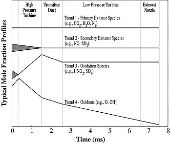 7.6. Turbine and Nozzle Effects on Emissions This section describes what is known and not known about changes in various exhaust constituents that occur downstream of the combustor, in the air passages of the turbine and exhaust nozzle. The discussion centers on chemical species that are expected to have the highest potential for impact on the global atmosphere (see Chapters 2 and 3).