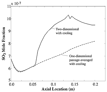 The discussion begins in Section 7.6.1 with a review of the factors that have generated interest in chemical processes in the turbine and exhaust nozzle. Section 7.6.2 provides a brief overview of functional requirements and constraints for aircraft turbines and nozzles, and how these requirements have led to particular design choices. Section 7.6.3 describes the relevant chemical and fluid mechanical effects. Section 7.6.4 describes what is known and not known regarding chemical changes in the turbine and exhaust nozzle. 7.6.1. Chemical Processes in Turbine and Exhaust Nozzle Many engine exhaust species of interest for environmental impact assessment exist in trace amounts, typically tens of ppbv to tens of ppmv. Despite their relatively small concentrations, these trace species emissions can result in perturbations of chemical species in the atmosphere that may induce significant atmospheric effects. Chapters 2 and 3 discuss these issues in relation to atmospheric ozone and cloudiness, respectively. Numerical simulations and a limited number of experiments suggest that several of these trace species can undergo considerable change within the nonuniform, unsteady flow fields of the turbine and nozzle prior to injection into the atmosphere (Hunter, 1982; Harris, 1990; Brown et al., 1996; Lukachko et al., 1998). However, there is a high degree of uncertainty regarding the extent of this change and its dependence on engine technology and operating conditions. Indeed, estimates for the extent of sulfur oxidation (SO2 ' SO3 + H2SO4) range from 0.4 to 45% or more depending on the modeling assumptions and experimental data considered (Hunter, 1982; Harris, 1990; Arnold et al., 1994, 1999; Frenzel and Arnold, 1994; Miake-Lye et al., 1994; Fahey et al., 1995b; Brown et al., 1996; Kärcher et al., 1996; Hanisco et al., 1997; Lukachko et al., 1998; Miake-Lye et al., 1998). However, most of the predicted conversion efficiencies are less than 10%, with an experimentally derived lower limit of 0.34% (Curtius et al., 1998) (see Section 3.2.2.2). More important, such variations in estimates of the extent of sulfur oxidation within the engine and subsequent changes in aerosol formation lead to changes in predicted column ozone depletion by a fleet of supersonic transport aircraft by as much as a factor of 2 (Weisenstein et al., 1995; Danilin et al., 1997). Large uncertainty regarding trace species processes and the perception that intra-engine changes may be important-along with the desire for a more detailed and complete characterization of engine exhaust emissions to support downstream plume, wake, and atmospheric modeling efforts-have only recently motivated a more detailed study of intra-engine trace species chemistry (Dryer et al., 1993; Brown et al., 1996; NRC, 1997; Lukachko et al., 1998). There is relatively little research yet reported in this area; however, new measurement and modeling capabilities are currently being developed. 7.6.2. Aircraft Turbine and Nozzle Design Sections 7.4 and 7.5 discuss the principal elements and functions of the components of a gas turbine engine. They describe how, after exiting the combustor, the engine core flow passes into the turbine then through the exhaust nozzle (Figure 7-7 et seq.). Within these components, the principal engineering constraints are associated with maintenance of the structural integrity of the parts exposed to the high-temperature environment downstream of the combustor and limitations on weight. Figure 7-24 shows an example of a modern turbine stage. The design of the flow passages ensures maximum operating efficiency and meets engineering integrity requirements of the compressor and combustor. As explained in Section 7.4, the achievement of high thermal efficiency, hence low fuel consumption, means that turbines operate in gas flows that are several hundred Kelvin above the melting point of the materials employed (see, e.g., Kerrebrock, 1992). Cooling of all structures exposed to the flow path is therefore essential. The requirement for cooling adds significant complexity to the blades and vanes because of the need for small internal passages through which air bled from the compressor is channelled. This air is usually injected through small holes in the surfaces of the various components (as shown in Figure 7-24) to form a protective, cooler boundary layer. Air injected in this manner can account for as much as 25% of the flow through the core of the engine. The trend for increased temperature and pressure is expected to continue in the future, as discussed in Section 7.4. 7.6.3. Chemical and Fluid Mechanical Effects