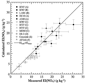 7.7. Engine Emissions Database and Correlation Since the early 1970s, when engine manufacturers started measuring emissions to demonstrate compliance with regulations developed for the airport vicinity, there has been a steady increase in data available for the development and refinement of databases associated with subsonic aircraft engine emissions. This section provides a brief overview of current ICAO engine standards and the status of the emissions database. It also discusses methods used to correlate sea-level emissions measurements with in-flight levels. Special emphasis is placed on simplified methods of NOx prediction and their validation for inventory purposes, as well as emissions variability. 7.7.1. ICAO Engine Standards and Emission Database To control pollutants from aircraft in the vicinity of airports, ICAO established emissions measurement procedures and compliance standards for soot (measured as smoke number-SN), unburned hydrocarbons, carbon moNOxide, and oxides of nitrogen. A landing and take-off cycle was defined to characterize the operational conditions of an aircraft engine within the environs of an airport; this LTO cycle is illustrated in Figure 7-28. The standards are applied to all newly manufactured turbojet and turbofan engines that exceed 26.7 kN rated thrust output at International Standard Atmosphere (ISA) sea level static (SLS) conditions. The smoke standards took effect in 1983, and those for gaseous emissions took effect in 1986. Measurements of the exhaust emissions of a single engine are performed at the manufacturer's test facilities as part of the certification process, in compliance with the requirements of ICAO international standards and recommended practices of Annex 16 to the convention on international aviation (ICAO, 1993). The data are published in an ICAO exhaust emissions data bank (ICAO 1995b). Engine emissions are given for the standardized LTO cycle represented by an engine power setting of 7 (taxiing), 30 (approach), 85 (climb-out), and 100% (take-off) of rated output and given times in mode (see Figure 7-28 and Table 7-8). Together with fuel flow, emission indices of HC, CO, and NOx in g per kg of fuel burned and maximum SN are reported. For a variety of engines, the measured SNs for all power settings are provided. Except for smoke, the emissions of each LTO cycle mode (EI x fuel flow x time in mode) are summed (Dp) and expressed in the form Dp/F00 (g kN) where (F00) is the maximum thrust of the engine at take-off under ISA SLS conditions.
