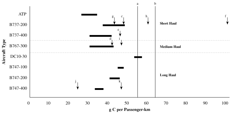 The amount of CO2 emitted per passenger-km for different modes of transport is very dependent on the type of aircraft, train, or car and on the load factor. Typical CO2 emissions for air transport are in the range of 30 to 110 g C per passenger-km, which is comparable with passengers travelling by car or light truck. Emission of CO2 per passenger-km from bus or coach transport is significantly lower (< 20 g C per passenger-km). For rail travel, CO2 emissions per passenger-km depend on several factors, such as source of primary energy, type of locomotive, and load factor; emissions vary between < 5 and 50 g C per passenger-km. |
