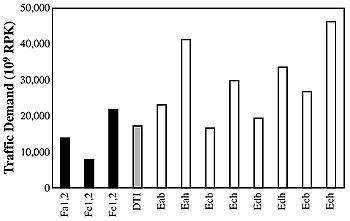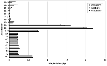 The 1,000-unit fleet should not be considered a forecast of the actual number of HSCTs that might be in the fleet in 2050. For this sensitivity study, the 1,000-unit value was chosen to represent a fleet that would be the result of a successful HSCT program; this fleet size also was chosen so that previous fleet projections could be used (Baughcum and Henderson, 1998). No changes in fuel efficiency or NOx emissions technology relative to the assumptions used in the reference were assumed for the 2050 HSCT. A detailed description of the route system flown by the 1,000 HSCTs is given by Baughcum and Henderson (1998). Fleet fuel burned with the HSCT was calculated by assuming that the fuel efficiency and NOx emissions of the subsonic fleet were described by NOx technology scenario 1, the "fuel efficiency" scenario. Table 9-21 gives the total fleet fuel burned and NOx emissions with and without the assumed 1,000-unit HSCT fleet. Fleet fuel burned increases as a result of the substitution of less fuel efficient HSCTs for subsonic airplanes (present HSCT designs have about half the fuel efficiency, measured as RPK per fuel burned, of present subsonic airplanes). However, fleet NOx emissions decrease in spite of the increase in fuel burned because the HSCT is assumed to be designed for very low NOx emissions [cruise EI(NOx) of 5]. A comparison of the altitudinal distributions of fuel use and NOx emissions between the all-subsonic fleet and a fleet containing subsonic and HSCT aircraft is shown in Figures 9-24 and 9-25 for the FESG year 2050 IS92a scenario. The introduction of an HSCT fleet with EI(NOx)=5 combustors would be expected to increase emissions above 12-km altitude and lead to a decrease of NOx emissions below 12, particularly in the 10-12 km band, assuming that the introduction of an HSCT will cause a displacement of subsonic traffic.