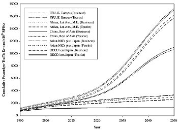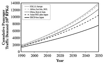9.6.2. Structure and Assumptions Before we review the outcomes of the scenario studies in the following section, we consider some differences and similarities between the models. This comparison is restricted to the EDF, DTI, and FESG models. Although the MIT model provides an interesting insight into future travel options based on the thesis of invariant travel time and travel expenditure budgets, it is excluded from this comparison because it provides only a highly aggregated scenario for the future mobility of total motorized passenger traffic; air traffic is only one-albeit important-portion of this picture, and the aircraft component cannot be identified. The WWF aviation scenario for 2041 provides aggregated fuel burned and CO2 emissions projections but does not provide regionally distributed NOx emissions estimates. Of the long-term scenarios considered, the EDF, FESG, and DTI studies allow assessment of the impacts of CO2 from aviation. However, only the results from the DTI and the FESG models are suitable for use in chemical transport models for modeling other emissions (see Chapters 2 and 4) and their effects on radiative forcing (see Chapter 6) because they provide gridded data that include a consideration of the potential changes in the spatial distribution of emissions. Only the EDF study provides scenarios for demand from the aviation sector and subsequent global CO2 and NOx emissions to 2100. The EDF study provided 10 scenarios based on five different IPCC IS92 world scenarios for the long-term development of world economy and population and two air traffic demand scenarios (base case and high case). The FESG study calculated three air traffic demand scenarios based on the IPCC IS92a, IS92c, and IS92e world scenarios, which were combined with two engine technology scenarios to produce six different emissions inventories. The FESG scenarios of regional and global air traffic were based on a logistic regression model of traffic demand since 1960 using global GDP as a predictor. The FESG model used a combination of top-down and bottom-up approaches, in which global volumes of civil aircraft flight kilometers were predicted using the regression model for different GDP scenarios. All available information on regions, including regional variation in growth, was then used to disaggregate these global values in a consistent way over 45 traffic flows within and between the regions of the world by using a market share allocation model. Year 2050 values of fuel burned and NOx emissions for military traffic were estimated separately. The EDF scenarios also were based on the use of logistic growth curves to model air traffic growth for business and personal travel (plus military and freight traffic). Model parameters were chosen through observation of historical traffic trends in the United States. Regional population was used as a predictor of personal passenger travel, and regional GNP was used as a predictor of business passenger travel and freight demand. Both the FESG and EDF models incorporate the underlying assumption that the chosen parameters are satisfactory predictors of aviation demand and that aviation markets eventually mature. There are large differences between the EDF and FESG models with respect to the development of emissions scenarios. The EDF model uses a constant capacity logistic to describe fuel efficiency improvements, which extrapolates Greene's (1992) forecast to 2010 with varied rates for five geographic world regions and the military/freight aviation sector. For the trend in fleet EI(NOx) a single global logistic model extrapolates from the 1990 and 2015 values. The FESG scenarios are based on two engine technology scenarios developed by ICCAIA for ICAO/FESG and IPCC (see Chapter 7). These scenarios represent an industry perspective on likely future developments in fuel efficiency and NOx reduction technologies, as well as further potentials and limitations. The fuel efficiency technology element of the DTI scenario was similar in this respect, but a NOx technology scenario appropriate to stricter emissions regulations was assumed, in which subsonic engine research programs would deliver emissions levels similar to those targeted in the NASA HSCT program. Additional assumptions are also important to the results of the scenario models. In the EDF model, assumptions about the dates of market expansion and maturity and the ultimate capacity levels chosen for the economic regions strongly influence the outcomes. The EDF, FESG, and DTI models all use statistics of traffic/air traffic from international organizations and OECD countries, as well as numerous other recently published sources, and adopt one or more of the IPCC IS92 scenarios to describe the long-term development of worldwide economic growth and population. The FESG, EDF, and DTI models also use information from the NASA and ANCAT/EC gridded inventories of traffic flows and related emissions. The FESG models used new, partly proprietary, information from industry as a base to project emissions in the year 2050. None of the 3-D gridded inventories for 2050 assume any changes in design that would alter the cruise altitudes of subsonic aircraft. Furthermore, no consideration was given in any of the 2050 scenarios reported here to the possible stimulative (or otherwise) effect of HSCT introductions on traffic.