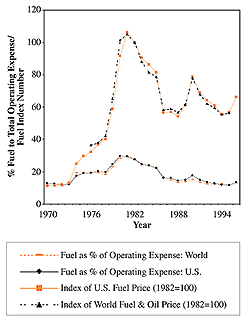 10.4.1.2. Cost StructureAfter 1976, costs of operation fell rapidly for U.S. operators. In real terms, costs per revenue-tonne-km have declined more than 25%. Similar declines have been achieved internationally. Lower passenger fares and cargo rates have paced this reduction in costs. As a result, airline profits have remained low relative to other industries. For the industry, airline profits are a significant source of funds for purchasing capital assets. Timely acquisition of new technologies has been viewed as necessary for environmental mitigation. Recent volatility in industry profits is related primarily to short-term changes in demand and short-term overcapacity of aircraft (Winston, 1998).Fuel cost and consumption are important to the mitigation measures discussed below. Examination of the historical record indicates that aviation fuel productivity has increased considerably. ICAO estimates that, while aggregate fuel consumption for the 1976-90 period grew approximately 60%, world civil air traffic (passengers, freight, and mail combined) increased about 150%. These figures are explained by an increased average load factor, a more optimal aircraft fleet mix, greater engine efficiency, and improved system capacity (Balashov and Smith, 1992). The amount of fuel consumed and fuel productivity affect airline profits and ticket prices. Of interest to the policymaker is the effect of a change in fuel price on airline cost and fare structures and on passenger and cargo demand. Figure 10-1 shows the percentage of total annual airline expense attributable to fuel cost for U.S. and world airlines over time and compares changes in this ratio against changes in the index of fuel prices for the United States and the world. Data for the figure were extracted from industry and ICAO published sources (ICAO, 1996b; Aerospace Industries Association of America, 1998). The data indicate that average fuel cost across the industry has recently represented about 11-15% of operating costs, but has been higher during times of high fuel prices (e.g., nearly 30% in the early 1980s). Further analyses of the impact of fuel prices on demand and industry profitability are needed. Against the background of these underlying trends, the potential role of mitigation measures is considered in further reducing the growth of aircraft emissions by forcing technology, changing industry practices, and dampening growth in traffic. Atmospheric environmental impacts associated with aviation emissions include greenhouse gas emissions, ozone depletion, acidification, and impact on local air quality. Cruise altitude (above 900 m) aircraft emissions of interest are CO2, NOx, particulates and aerosols, sulfur compounds, and H2O. Ground-level (altitude below 900 m) aircraft emissions of interest to local air quality issues are NOx, carbon moNOxide (CO), unburned hydrocarbons (HC), and other volatile organic compounds. Ground-level CO2 emissions from aircraft are of interest because of their effects on climate. This section examines more fully two technology-based means for mitigating the adverse effects of aviation emissions. 10.4.2.1. Operational Means to Reduce EmissionsThe environmental aim of air traffic system modernization and operational measures is to reduce fuel consumption, hence emissions, through improvement in the overall efficiency of the air traffic system. For 1995, U.S. airlines reported a 79% "on-time" arrival rate for all domestic flights (i.e., flights arriving within 15 minutes of schedule), including canceled flights and those with mechanical delays. For 1996, this figure was 75%. This decline indicates the scope of current congestion and delay problems (U.S. Department of Transportation, 1998). U.S. Federal Aviation Administration (FAA) data show that annual system delays of 15 minutes or longer (as a percent of total operations) have declined steadily from 2.2% in 1989 to 1.2% in 1997. Over that period, 55-70% of these delays were caused by weather; 25-35% were caused by terminal volume and closed runways and taxiways (U.S. Federal Aviation Administration, 1977). FAA estimates of the total cost for air carrier delay (operating plus passenger time costs) grew from $6.5 billion in 1987 to $9.5 billion in 1994. Except for the cost of fuel, environmental costs were not considered (U.S. Federal Aviation Administration, 1995). The European Organisation for Safety and Navigation (EUROCONTROL) reports that air traffic delays in Europe are primarily the result of national institutional factors, capacity overloads, and air traffic control inefficiencies. Association of European Airlines (AEA) data show that in 1989, the number of departures for short- and medium-term flights delayed by more than 15 minutes was 23.8%. This figure dropped to 12.7% in 1993, but has risen steadily since then: The rate was 19.5% in 1997 and 20.1% for the January-June 1998 period (Association of European Airlines, 1998). These data are consistent with EUROCONTROL data for the same years (EUROCONTROL, 1998). ICAO air traffic system policies, plans, standards, and recommended practices have not been regarded as measures that might be used to achieve environmental gains. Studies assessing the costs and benefits of CNS/ATM modernization conclude that the benefits to airlines and passengers from reduced delays and fuel savings far outweigh the incremental costs. Recent studies have focused on estimating the environmental benefits of a more efficient air traffic system. These studies indicate that emissions from aviation may be reduced significantly. Although states are working within ICAO toward global modernization of the air traffic system, this activity has only recently been placed in the context of addressing environmental issues (EISG, 1995; Aylesworth, 1997; U.S. Federal Aviation Administration, 1998a,b). Studies and working papers prepared for CAEP/3 Working Group 3 (emissions) and the ICAO Worldwide CNS/ATM Systems Implementation Co