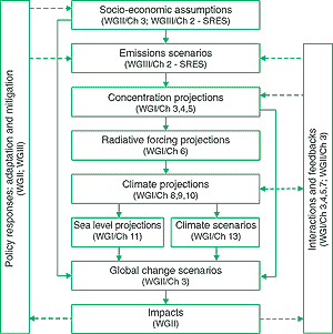 This Section looks into the future in a different way. Uncertainties are present in each step of the chain from emissions of greenhouse gases and aerosols, through to the impacts that they have on the climate system and society (see Figure 28). Many factors continue to limit the ability to detect, attribute, and understand current climate change and to project what future climate changes may be. Further work is needed in nine broad areas. G.1 Data Arrest the decline of observational networks in many parts of the world. Unless networks are significantly improved, it may be difficult or impossible to detect climate change in many areas of the globe.Expand the observational foundation for climate studies to provide accurate, long-term data with expanded temporal and spatial coverage. Given the complexity of the climate system and the inherent multi-decadal time-scale, there is a need for long-term consistent data to support climate and environmental change investigations and projections. Data from the present and recent past, climate-relevant data for the last few centuries, and for the last several millennia are all needed. There is a particular shortage of data in polar regions and data for the quantitative assessment of extremes on the global scale. G.2 Climate Processes and Modelling Estimate better future emissions and concentrations of greenhouse gases and aerosols. It is particularly important that improvements are realised in deriving concentrations from emissions of gases and particularly aerosols, in addressing biogeochemical sequestration and cycling, and specifically, and in determining the spatial-temporal distribution of CO2 sources and sinks, currently and in the future.Understand and characterise more completely dominant processes (e.g., ocean mixing) and feedbacks (e.g., from clouds and sea ice) in the atmosphere, biota, land and ocean surfaces, and deep oceans. These sub-systems, phenomena, and processes are important and merit increased attention to improve prognostic capabilities generally. The interplay of observation and models will be the key for progress. The rapid forcing of a non-linear system has a high prospect of producing surprises. Address more completely patterns of long-term climate variability. This topic arises both in model calculations and in the climate system. In simulations, the issue of climate drift within model calculations needs to be clarified better in part because it compounds the difficulty of distinguishing signal and noise. With respect to the long-term natural variability in the climate system per se, it is important to understand this variability and to expand the emerging capability of predicting patterns of organised variability such as ENSO. Explore more fully the probabilistic character of future climate states by developing multiple ensembles of model calculations. The climate system is a coupled non-linear chaotic system, and therefore the long-term prediction of future exact climate states is not possible. Rather the focus must be upon the prediction of the probability distribution of the system’s future possible states by the generation of ensembles of model solutions. Improve the integrated hierarchy of global and regional climate models with emphasis on improving the simulation of regional impacts and extreme weather events. This will require improvements in the understanding of the coupling between the major atmospheric, oceanic, and terrestrial systems, and extensive diagnostic modelling and observational studies that evaluate and improve simulative performance. A particularly important issue is the adequacy of data needed to attack the question of changes in extreme events. G.3 Human Aspects Link more formally physical climate-biogeochemical models with models of the human system and thereby provide the basis for expanded exploration of possible cause-effect-cause patterns linking human and non-human components of the Earth system. At present, human influences generally are treated only through emission scenarios that provide external forcings to the climate system. In future more comprehensive models are required in which human activities need to begin to interact with the dynamics of physical, chemical, and biological sub-systems through a diverse set of contributing activities, feedbacks and responses.G.4 International Framework Accelerate internationally progress in understanding climate change by strengthening the international framework that is needed to co-ordinate national and institutional efforts so that research, computational, and observational resources may be used to the greatest overall advantage. Elements of this framework exist in the international programmes supported by the International Council of Scientific Unions (ICSU), the World Meteorological Organization (WMO), the United Nations Environment Programme (UNEP), and the United Nations Education, Scientific and Cultural Organisation (UNESCO). There is a corresponding need for strengthening the co-operation within the international research community, building research capacity in many regions and, as is the goal of this assessment, effectively describing research advances in terms that are relevant to decision making. |