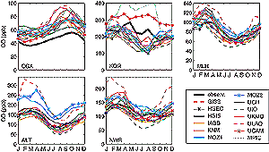 The OxComp workshop defined a series of atmospheres and emission scenarios. These included Y2000, a new reference atmosphere meant to represent year 2000 that provides a baseline from which all changes in greenhouse gases were calculated. For Y2000, abundances of long-lived gases were prescribed by 1998 measurements (Table 4.1a), and emissions of short-lived pollutants, NOx, CO and VOC, were based primarily on projections to the year 2000 of GEIA/EDGAR emissions for 1990 (Olivier et al., 1998, 1999), see Section 4.3.1. Stratospheric O3 was calculated in some models and prescribed by current observation in others. The predicted atmospheric quantities in all these simulations are therefore short-lived tropospheric gases: O3, CO, NOx, VOC, OH and other radicals. Following the GIM model study (Kanakidou et al., 1999), we use atmospheric measurement of O3 and CO to test the model simulations of the current atmosphere. The Y2000 atmosphere was chosen because of the need for an IPCC baseline, and it does not try to match conditions over the l980s and 1990s from which the measurements come. Although the observed trends in tropospheric O3 and CO are not particularly large over this period and thus justify the present approach, a more thorough comparison of model results and measurements would need to use the regional distribution of the pollutant emissions for the observation period. The seasonal cycle of O3 in the free troposphere (700, 500, and 300 hPa) has been observed over the past decade from more than thirty ozone sonde stations (Logan, 1999). These measurements are compared with the OxComp Y2000 simulations for Resolute (75°N), Hohenpeissenberg (48°N), Boulder (40°N), Tateno (36°N), and Hilo (20°N) in Figure 4.10. Surface measurements from Cape Grim (40°S), representative of the marine boundary layer in southern mid-latitudes, are also compared with the models in Figure 4.10. With the exception of a few outliers, the model simulations are within ±30% of observed tropospheric O3 abundance, and they generally show a maximum in spring to early summer as observed, although they often miss the month of maximum O3. At 300 hPa the large springtime variation at many stations is due to the influence of stratospheric air that is approximately simulated at Resolute, but, usually overestimated at the other stations. The CTM simulations in the tropics (Hilo) at 700 to 500 hPa show much greater spread and hence generally worse agreement with observations. The mean concentration of surface O3 observed at Cape Grim is well matched by most models, but the seasonality is underestimated. Observed CO abundances are compared with the Y2000 model simulations in Figure 4.11 for surface sites at various altitudes and latitudes: Cape Grim (CGA, 94 m), Tae Ahn (KOR, 20 m), Mauna Loa (MLH, 3397 m), Alert (ALT, 210 m), and Niwot Ridge (NWR, 3475 m). The Alert abundances are well matched by most but not all models. Niwot Ridge and Mauna Loa are reasonably well modelled except for the February to March maximum. At Tae Ahn, the models miss the deep minimum in late summer, but do predict the much larger abundances downwind of Asian sources. At Cape Grim the seasonal cycle is matched, but the CO abundance is uniformly overestimated (30 to 50%) by all the models, probably indicating an error in Southern Hemisphere emissions of CO. Overall, this comparison with CO and O3 observations shows good