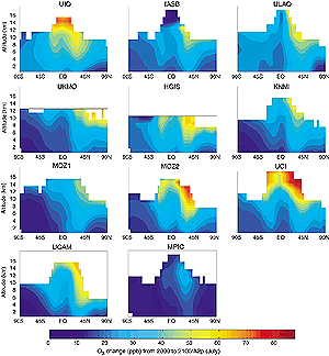 The OxComp workshop also defined a series of perturbations to the Y2000 atmosphere for which the models reported the monthly averaged 3-D distribution of O3 abundances and the budget for CH4, specifically the loss due to reaction with tropo-spheric OH. From these diagnostics, the research group at Oslo calculated the change in global mean tropospheric O3 (DU) and in OH (%) relative to Y2000, as shown in Table 4.11. For each model at every month, the “troposphere” was defined as where O3 abundances were less than 150 ppb in the Y2000 simulation, a reasonably conservative diagnostic of the tropopause (see Logan, 1999). Because O3 is more effective as a greenhouse gas when it lies above the surface boundary layer (SAR; Hansen et al., 1997a; Prather and Sausen, 1999; Chapter 6 of this report), the model study diagnosed the O3 change occurring in the 0 to 2 km layers of the model. This amount is typically 20 to 25% of the total change and is consistent across models and types of perturbations here.