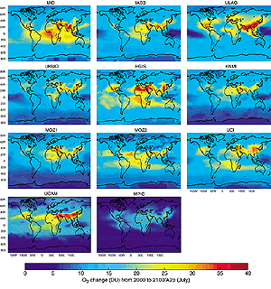 future scenarios are not assessed. The apparent agreement on predicting the single global, annual mean tropospheric O3 increase, e.g., Case B in Table 4.11, belies the large differences as to where this increase occurs and what is its peak magnitude. The spatial distributions of the tropospheric O3 increases in July for Case B are shown in Figure 4.12 (latitude by altitude zonal average abundance, ppb) and Figure 4.13 (latitude by longitude column density, DU) for nine CTMs. The largest increase in abundance occurs near the tropopause at 40°N latitude; yet some models concentrate this increase in the tropics and others push it to high latitudes. In terms of column density, models generally predict large increases along the southern edge of Asia from Arabia to eastern China; although the increases in tropical, biomass-burning regions varies widely from model to model.