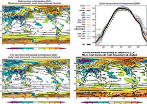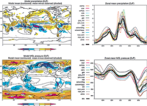 8.5.1.2 Tropospheric climate8.5.1.2.1 Surface quantitiesThe SAR’s evaluation of coupled-model simulations focused on surface air temperature, sea level pressure and precipitation. The SAR concluded that model simulations of surface air temperature were “very similar” to observations. Simulations of the other two quantities were found to be less accurate but nevertheless reasonable: the SAR concluded that coupled models represented “the observed large-scale geographical distribution” of sea level pressure “rather well”, and that they were “generally successful in simulating the broad-scale structure of the observed precipitation”. Figures 8.2 and 8.3 (reproduced from Lambert and Boer, 2001) update this assessment using coupled model output from the CMIP1 database. For each quantity, the figures show both a map of the average over all fifteen models (“model mean”) and zonal means for all individual fifteen models. Lambert and Boer (2001) demonstrate that the model mean exhibits good agreement with observations, often better than any of the individual models. Inspection of these portions of the figures reaffirms the SAR conclusions summarised above. The errors in model-mean surface air temperature rarely exceed 1°C over the oceans and 5°C over the continents; precipitation and sea level pressure errors are relatively greater but the magnitudes and patterns of these quantities are recognisably similar to observations. The bottom portion of Figure 8.2 shows maps of the model mean taken separately over all flux adjusted models (lower left) and all non-flux adjusted models (lower right). Flux adjusted models are generally more similar to the observations - and to each other - than are non-flux adjusted models. However, errors in the non-flux adjusted model mean are not grossly larger than errors in the flux adjusted model mean (except in polar regions). This result from the “inter-model” CMIP database suggests that the SAR was correct in anticipating that the need for flux adjustments would diminish as coupled models improve. It is reinforced by “intra-model ensembles”, i.e., by the experience that improvements to individual models can reduce the need for flux adjustments (e.g., Boville and Gent, 1998).