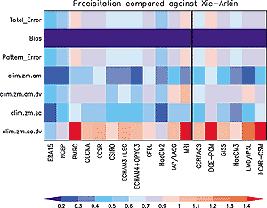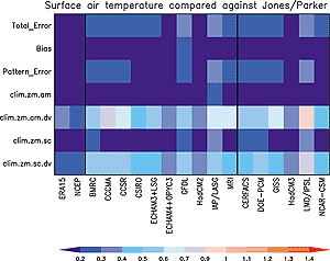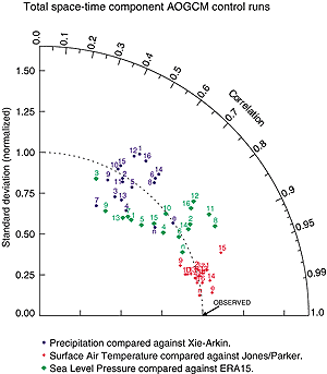 The foregoing points are made in a more quantitative fashion by Figures 8.4 to 8.6 (reproduced from Covey et al., 2000b). Figure 8.4 gives the standard deviation and correlation with observations of the total spatial and temporal variability (including the seasonal cycle, but omitting the global mean) for surface air temperature, sea level pressure and precipitation in the CMIP2 simulations. The standard deviation is normalised to its observed value and the correlation ranges from zero along an upward vertical line to unity along a line pointing to the right. Consequently, the observed behaviour of the climate is represented by a point on the horizontal axis a unit distance from the origin. In this coordinate system, the linear distance between each model’s point and the “observed” point is proportional to the r.m.s. model error (Taylor, 2000; see also Box 8.1). Surface air temperature is particularly well simulated, with nearly all models closely matching the observed magnitude of variance and exhibiting a correlation > 0.95 with the observations. Sea level pressure and precipitation are simulated less well, but the simulated variance is still within ±25% of observed and the correlation with observations is noticeably positive (about 0.7 to 0.8 for sea level pressure and 0.4 to 0.6 for precipitation). Observational uncertainties are indicated in Figure 8.4 by including extra observational data sets as additional points, as if they were models. These additional points exhibit greater agreement with the baseline observations as expected. It is noteworthy, however, that the differences between alternate sets of observations are not much smaller than the differences between models and the baseline observations. This result implies that in terms of variance and space-time pattern correlation, the models nearly agree with observations to within the observational uncertainty. Figures 8.5 and 8.6 show global mean errors (“bias”) and root mean square (r.m.s.) errors normalised by standard deviations for surface air temperature and precipitation in CMIP2 model simulations. Both the r.m.s. errors and the background standard deviations are calculated from the full spatial and temporal variability of the fields. The r.m.s. errors are divided into a number of components such as zonal mean vs. deviations and annual mean vs. seasonal cycle. For nearly all models the r.m.s. error in zonal- and annual-mean surface air temperature is small compared with its natural variability. The errors in the other components of surface air temperature, and in zonal mean precipitation, are relatively larger but generally not excessive compared with natural variability. In Figures 8.5 and 8.6, models are divided into flux adjusted and non-flux adjusted classes. Slight differences between the two may be discerned, but it is not obvious that these are statistically significant if the two classes are considered as random samples from a large population of potential climate models. The same conclusion was reached in a detailed study of the seasonal cycle of surface air temperature in the CMIP models (Covey et al., 2000a). (That study, however, also noted that many of the non-flux adjusted models suffered from unrealistic “climate drift” up to about 1°C / century in global mean surface temperature.) The relatively small differences between flux adjusted and non-flux adjusted models noted above suggest that flux adjustments could be - indeed, are being - dispensed with at acceptable cost in many climate models, at least for the century time-scale integrations of interest in detecting and predicting anthropogenic climate change. In recent models that omit flux adjustment, the representation of atmospheric fields has in some cases actually improved, compared with older, flux-adjusted versions of the models. Examples include the HadCM3 model and the CSM 1.0 model. In CSM 1.0, atmospheric temperature, precipitation and atmospheric circulation are close to values simulated when the atmospheric component of the CSM 1.0 model is driven by observed sea surface temperatures (Boville and Hurrell, 1998).
