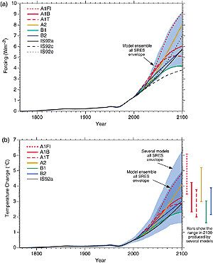 This section investigates the range of future global mean temperature changes resulting from the thirty-five final SRES emissions scenarios with complete greenhouse gas emissions (Nakic´enovic´ et al., 2000). This range is compared to the expected range of uncertainty due to the differences in the response of several AOGCMs. Forcing uncertainties are not considered in these calculations. As well as envelope results that incorporate all the SRES scenarios, six specific SRES scenarios are considered. These are the four illustrative marker scenarios A1B, A2, B1 and B2 and two further illustrative scenarios from the A1 family representing different energy technology options; A1FI and A1T (see Section 9.3.1.3 and Box 9.1). For comparison, results are also shown for some of the IS92 scenarios. As discussed in Section 9.3.1.3 some AOGCMs have run experiments with some or all of the four draft marker scenarios. In order to investigate the temperature change implications of the full range of the final SRES scenarios, a simple climate model is used as a tool to simulate the AOGCM results (Wigley and Raper, 1992; Raper et al., 1996, 2001a). The tuning of the simple model to emulate the different AOGCM results is described in Appendix 9.1. The original SRES MiniCAM (Mini Climate Assessment Model from the Pacific Northwest National Laboratory, USA) scenarios did not contain emissions for the reactive gases CO, NMVOCs, and NOx (Nakic´enovic´ et al., 2000). To facilitate the calculations, the MiniCAM modelling team provided emissions paths for these gases. For the six illustrative SRES scenarios, anthropogenic emissions are shown for CO2 in Chapter 3, Figure 3.12, tabulated for CH4 and N2O in Appendix II and shown in Nakic´enovic´ et al. (2000), and shown for SO2 in Chapter 5, Figure 5.13. It is evident that these scenarios encompass a wide range of emissions. Note in particular the much lower future sulphur dioxide emissions for the six SRES scenarios compared with the IS92a scenario. The calculation of radiative forcing from the SRES emission scenarios for the temperature projections presented here follows closely that described in Chapters 3, 4, 5 and 6, with some exceptions as described below. Further details of the forcing for the collective procedures (MAGICC model) are given by Wigley (2000). Atmospheric concentrations of the greenhouse gases are calculated from the emissions using gas cycle models. For CO2, the model of Wigley (1993) is used and as described therein, the CO2 fertilisation factor is adjusted to give a balanced 1980s mean budget. To be consistent with Chapter 3, climate feedbacks are included and the model has been tuned to give results that are similar to those of the Bern-CC and ISAM models for a climate sensitivity of 2.5°C (Chapter 3, Figure 3.12). The strength of the climate feedbacks on the carbon cycle are very uncertain, but models show they are in the direction of greater temperature change giving greater atmospheric CO2 concentration. The climate feedbacks in the Bern-CC model are greater than those of the ISAM model and the feedback strength used here is about half as big as that in the ISAM model. The gas cycle models for CH4 and N2O and the other trace gases are identical to those used in Chapter 4. The concentrations for the main greenhouse gases for the six SRES scenarios are shown in Chapter 4, Figure 4.14. Except for the treatment of organic carbon (OC), black carbon (BC) and indirect aerosol forcing, the method of calculation for the radiative forcing follows closely that described in Chapter 6 and includes tropospheric ozone, halocarbons, and stratospheric ozone. For OC and BC this report’s best estimate forcing values for the present day given in Chapter 6, Table 6.11 are used. As pointed out in Chapter 5, past and future emissions of OC and BC are uncertain. Here fossil OC and BC direct aerosol forcings are considered together and are scaled linearly with SO2 emissions. Biomass burning OC and BC aerosol direct forcings are both scaled with gross deforestation. First (cloud albedo) indirect sulphate aerosol forcing components are included and scaled non-linearly with SO2 emissions as derived by Wigley (1991). A present day indirect sulphate aerosol forcing of –0.8 Wm-2 is assumed. This is the same value as that employed in the SAR. It is well within the range of values recommended by Chapter 6, and is also consistent with that deduced from model simulations and the observed temperature record (Chapter 12).