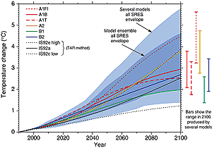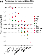 Considering the six illustrative scenarios, the bars on the right-hand side of Figure 9.14 show that scenarios A1FI and B1 alone, define the top and bottom of the range of projected temperature changes, respectively. Towards the middle of the range the scenario bars overlap, indicating that most of the projections fall within this region. In the corresponding sea level rise figure, because of the greater intertia in the ocean response, there is a greater overlap in the projected response to the various scenarios (see Chapter 11, Figure 11.12). In addition, the sea level range for a given scenario is broadened by inclusion of uncertainty in land ice estimates. By 2100, the differences in the surface air temperature response across the group of climate models forced with a given scenario is as large as the range obtained by a single model forced with the different SRES scenarios (Figure 9.15). Given the quasi-linear nature of the simple model, projections which go outside the range as yet explored by AOGCMs must be treated with caution, since non-linear effects may come into play. Further uncertainties arise due to uncertainties in the radiative forcing. The uncertainty in sulphate aerosol forcing is generally characterised in terms of the 1990 radiative forcing. Wigley and Smith (1998) and Smith et al. (2001) examined the effect of this uncertainty on future temperature change by varying the assumed 1990 sulphate radiative forcing by 0.6 Wm-2 above and below a central value of –1.1 Wm-2. Reducing the sulphate forcing increased the 1990 to 2100 warming by 0 to 7% (depending on the scenario), while increasing the sulphate forcing decreased warming over the next century by a similar amount. The sensitivity to the uncertainty in sulphate forcing was found to be significantly less in the new scenarios than in the IS92a scenario; in the latter the sensitivity to sulphate forcing was twice as large as the largest value for the SRES marker scenarios. Therefore, the smaller future emissions of sulphur dioxide in the new scenarios significantly lowers the uncertainty in future global mean temperature change due to the uncertain value of present day sulphate aerosol forcing. The climate effects described here use the SRES scenarios as contained in Nakic´enovic´ et al. (2000). Any feedbacks on the socio-economic development path, and hence on emissions, as a result of these climate changes have not been included. |