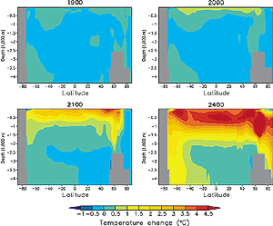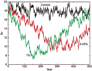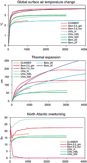 As mentioned earlier, the basis of the experiments discussed in the SAR is a transient increase of greenhouse gases throughout the integration. In the model integrations presented in this section, the CO2 concentration increases up to a certain value (e.g., a doubling of the CO2 concentration) and then remains constant for the remainder of the integration. Since this type of integration involves integrating the model for very long time periods (at least several centuries) only a few integrations have been performed using AOGCMs. Furthermore, no standard emission scenarios have been used for forcing these model runs and most have used idealised stabilisation values (2xCO2 or 3xCO2 or 4xCO2 for example). Again, in these integrations, the CO2 changes represent the radiative forcing changes of all the greenhouse gases. Results from the models of intermediate complexity are used to help understand the coupled model results, or in some cases, to explore areas where AOGCM integrations do not exist. Experiments where the coupled system is allowed time to reach equilibrium with the radiative forcing clearly show the response times of its various components. Even after the radiative forcing becomes constant, the surface air temperature continues to increase for many centuries (Figure 9.19) as noted in Section 9.3.4.1. The rate of warming after stabilisation is relatively small (<0.3°C per century, Figure 9.19b); however, the total warming after the radiative forcing stabilises can be significant (more than 1°C) because the warming continues for a long time period (Figure 9.19b). From Figure 9.19, one notes that the rate of warming after stabilisation varies from model to model. The slow rate of surface air temperature increase occurs as the heat anomaly slowly penetrates to depth in the ocean (Figure 9.23). The rate of penetration is dependent on the model’s vertical mixing both resolved by the model’s grid and by the sub-grid scale parametrizations. The effect of the oceanic mixing parametrizations on the coupled model response has been investigated using climate models of intermediate complexity (Figure 9.24): CLIMBER - Ganopolski et al. (2001); Bern 2.5_gm, Bern 2.5_hor - Stocker et al. (1992); Uvic - Fanning and Weaver (1996), Weaver et al. (1998), Wiebe and Weaver (2000); Bern_25, Bern_37 - Siegenthaler and Joos (1992), Joos et al. (1996). The effect on the response of the global mean surface air temperature, thermal expansion (see Chapter 11, Section 11.5.4.1 for a more complete discussion) and THC can be seen by comparing the results obtained from Stocker’s (Bern 2.5) models and the Uvic models (Weaver and Wiebe, 1999). The sub-grid scale mixing para-metrizations vary in the AOGCMs, accounting for much of the difference in the rate of surface warming (as seen in Figure 9.19b). The thermohaline circulation (THC) response is more complex than that of the surface air temperature in the stablisation integrations (compare Figure 9.19a with Figure 9.25, for example). Typically the THC weakens as the radiative forcing increases (Section 9.3.4.3). After the radiative forcing stabilises, the THC recovers to its control integration value. The initial weakening is caused by the warming of the mixed layer in the ocean and the increase in the freshwater flux in high latitudes. As the radiative forcing stablises, the tendency for the surface fluxes to weaken the THC is balanced by the changes in the ocean heat and water transports and vertical structure. It is found that the time-scale for this recovery varies from model to model (about a century to multi-centuries). Again it is likely that differences in the oceanic mixing are the cause for the differences in the recovery time. The time rate of change in the radiative forcing also affects both the weakening and recovery of the THC (Figure 9.25). In the GFDL_R15_a model when the CO2 increased at a rate of 1%/yr to doubling, the THC continued to weaken for 70 years after the point at which the CO2 was held constant at the doubled value (year 70). In a second integration, the CO2 increased at a rate of 0.25%/yr to doubling. In this integration, the THC does not weaken after the doubling point (Manabe and Stouffer, 1994), indicating that the behaviour of the THC response is highly dependent on the rate that the radiative forcing changes (Figure 9.25). Finally, it is important to note that the transient THC response (i.e., the weakening) is quite different from the equilibrium response of the THC (i.e., little change). This fact makes the interpretation of comparisons between palaeo-proxy data and coupled model results presented here difficult, since one needs to know the details of the changes in the radiative forcing and resolve relatively small time-scales in the proxy record. |