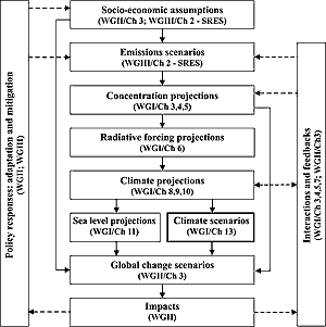 The specific climate scenario needs of the impacts community vary, depending on the geographic region considered, the type of impact, and the purpose of the study. For example, distinctions can be made between scenario needs for research in climate scenario development and in the methods of conducting impact assessment (e.g., Woo, 1992; Mearns et al., 1997) and scenario needs for direct application in policy relevant impact and integrated assessments (e.g., Carter et al., 1996a; Smith et al., 1996; Hulme and Jenkins, 1998). The types of climate variables needed for quantitative impacts studies vary widely (e.g., White, 1985). However, six “cardinal” variables can be identified as the most commonly requested: maximum and minimum temperature, precipitation, incident solar radiation, relative humidity, and wind speed. Nevertheless, this list is far from exhaustive. Other climate or climate-related variables of importance may include CO2 concentration, sea-ice extent, mean sea level pressure, sea level, and storm surge frequencies. A central issue regarding any climate variable of importance for impact assessment is determining at what spatial and temporal scales the variable in question can sensibly be provided, in comparison to the scales most desired by the impacts community. From an impacts perspective, it is usually desirable to have a fair amount of regional detail of future climate and to have a sense of how climate variability (from short to long time-scales) may change. But the need for this sort of detail is very much a function of the scale and purpose of the particular impact assessment. Moreover, the availability of the output from climate models and the advisability of using climate model results at particular scales, from the point of view of the climate modellers, ultimately determines what scales can and should be used. Scenarios should also provide adequate quantitative measures of uncertainty. The sources of uncertainty are many, including the trajectory of greenhouse gas emissions in the future, their conversion into atmospheric concentrations, the range of responses of various climate models to a given radiative forcing and the method of constructing high resolution information from global climate model outputs (Pittock, 1995; see Figure 13.2). For many purposes, simply defining a single climate future is insufficient and unsatisfactory. Multiple climate scenarios that address at least one, or preferably several sources of uncertainty allow these uncertainties to be quantified and explicitly accounted for in impact assessments. Moreover, a further important requirement for impact assessments is to ensure consistency is achieved among various scenario components, such as between climate change, sea level rise and the concentration of actual (as opposed to equivalent) CO2 implied by a particular emissions scenario. As mentioned above, climate scenarios that are developed for impacts applications usually require that some estimate of climate change be combined with baseline observational climate data, and the demand for more complete and sophisticated observational data sets of climate has grown in recent years. The important considerations for the baseline include the time period adopted as well as the spatial and temporal resolution of the baseline data. Much of this chapter is devoted to assessing how and how successfully these needs and requirements are currently met. |