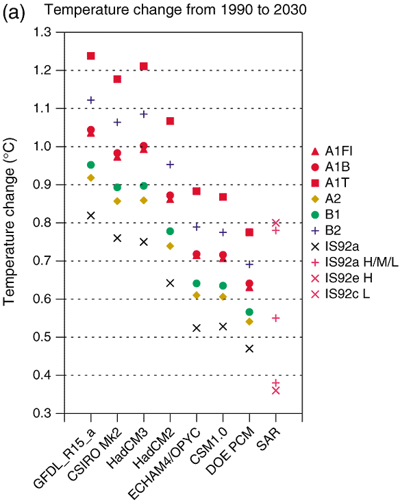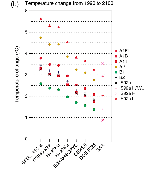 the six illustrative SRES scenarios and IS92a. The bottom axis indicates the AOGCM