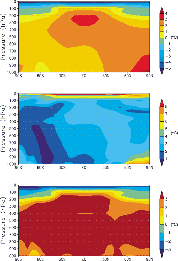 annual mean zonal temperature change (top), zonal mean temperature change range