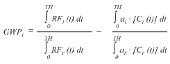 where TH is the time horizon, RFi is the global mean RF of component i, ai is the RF per unit mass increase in atmospheric abundance of component i (radiative efficiency), [Ci(t)] is the time-dependent abundance of i, and the corresponding quantities for the reference gas (r) in the denominator. The numerator and denominator are called the absolute global warming potential (AGWP) of i and r respectively. All GWPs given in this report use CO2 as the reference gas. The simplifications made to derive the standard GWP index include (1) setting g(t) = 1 (i.e., no discounting) up until the time horizon (TH) and then g(t) = 0 thereafter, (2) choosing a 1-kg pulse emission, (3) defining the impact function, I(∆C), to be the global mean RF, (4) assuming that the climate response is equal for all RF mechanisms and (5) evaluating the impact relative to a baseline equal to current concentrations (i.e., setting I(∆Cr(t)) = 0). The criticisms of the GWP metric have focused on all of these simplifications (e.g., O’Neill, 2000; Smith and Wigley, 2000; Bradford, 2001; Godal, 2003). However, as long as there is no consensus on which impact function (I(∆C)) and temporal weighting functions to use (both involve value judgements), it is difficult to assess the implications of the simplifications objectively (O’Neill, 2000; Fuglestvedt et al., 2003).