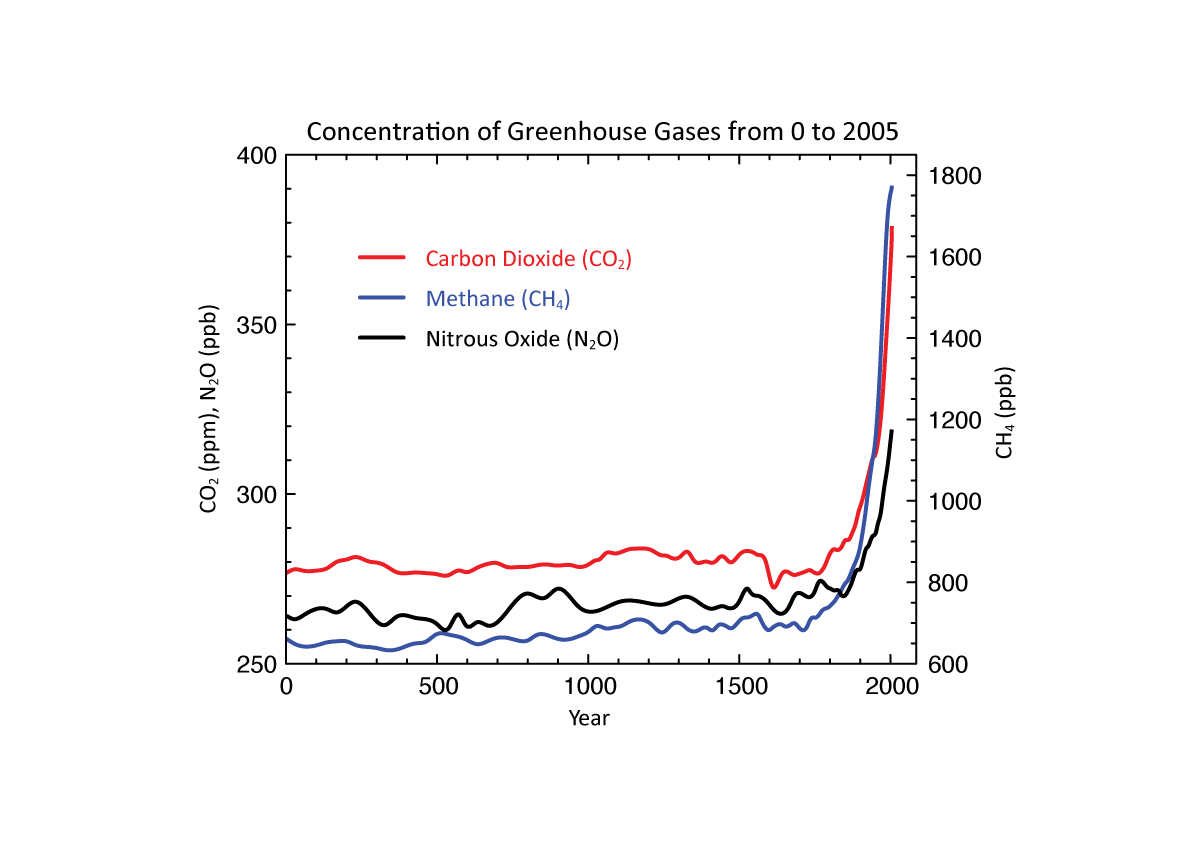 FAQ 2.1, Figure 1 (Errata). Revised figure showing atmospheric concentrations of important long-lived greenhouse gases over the last 2,000 years. Using the combined and simplified data from Chapters 6 and 2, the original figure displayed the CH4 curve incorrectly. The revised figure shows the same data correctly plotted. For further details please refer to the original figure caption.